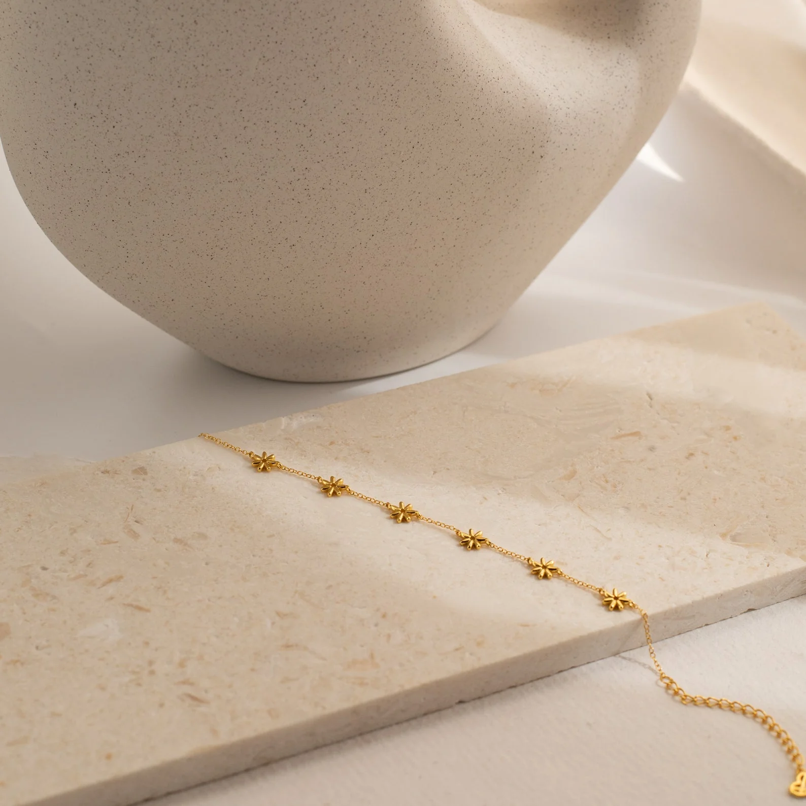 The Flower Child Bracelet is the perfect accessory for your cottage-core aesthetic. With its carefree, and nature inspired design, the delicate chain is stationed with dainty cut-out flowers versatile enough to also be your boho-hippie dream.