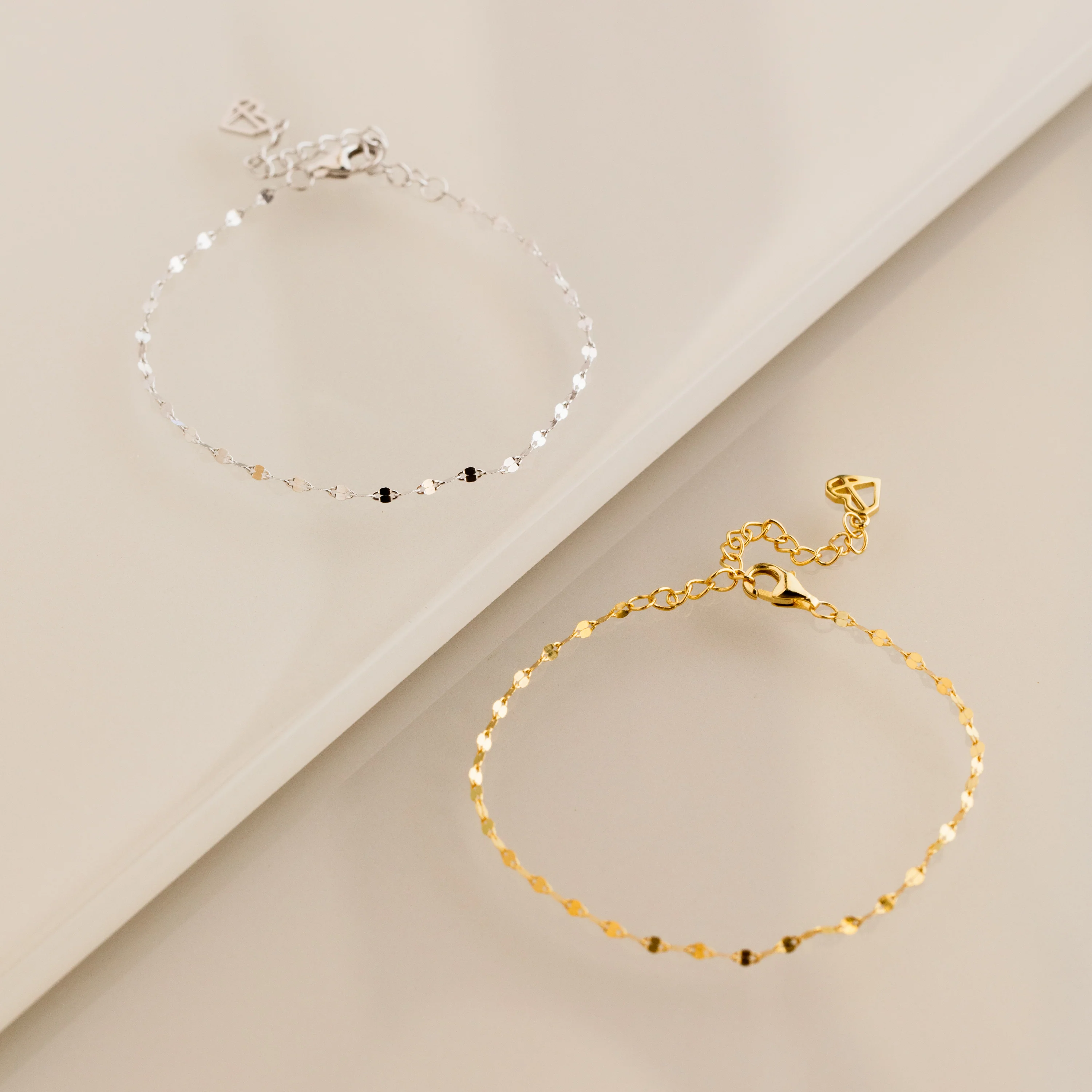 Our Josephine Chain Bracelet is a unique and dainty twist on a traditional anchor link. Each charm is placed perfectly to deliver a mirror-like glow. This the perfect versatile piece to wear alone or dress up your wrist stack