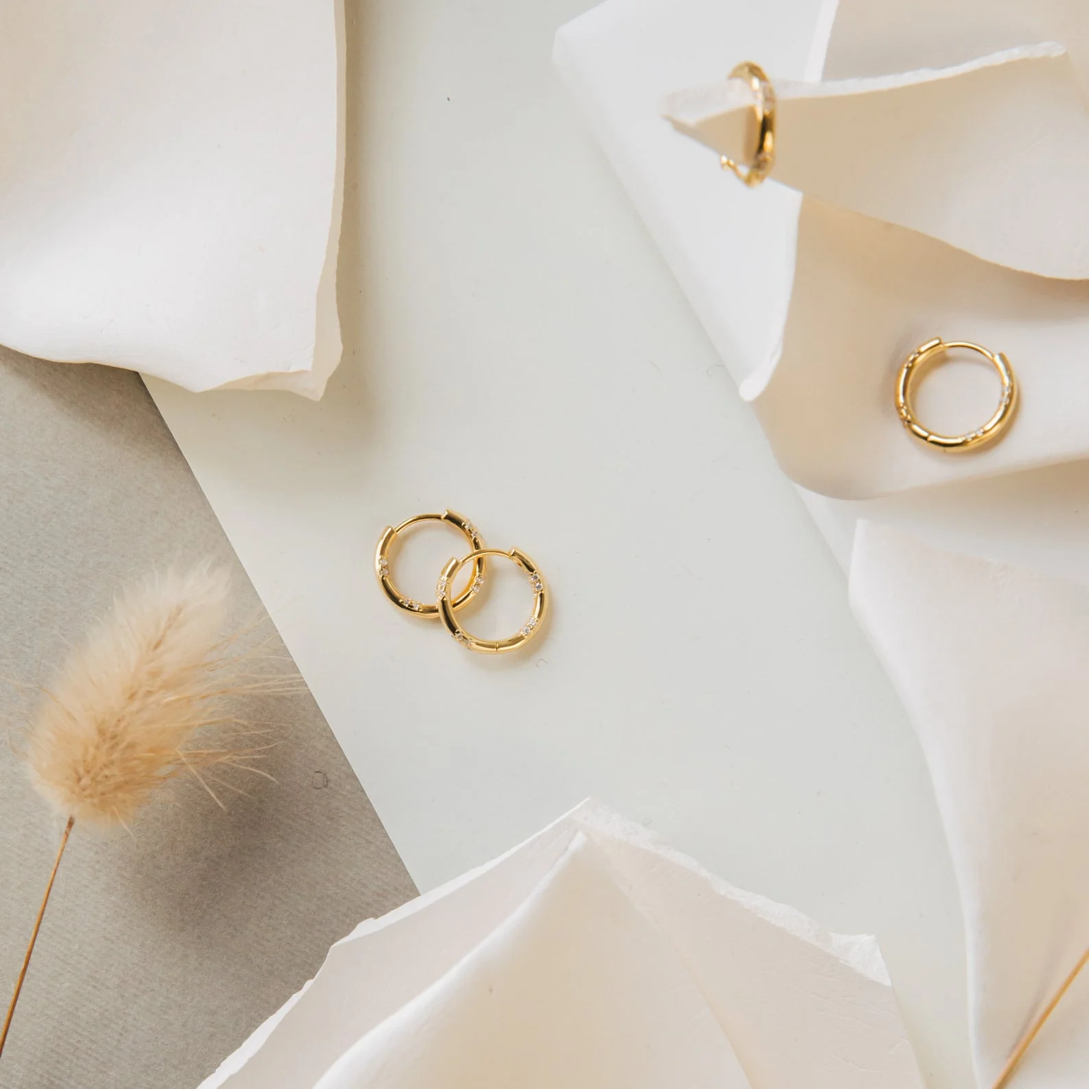 The Kaia Diamond Huggies showcase dainty little diamonds, evenly spaced across a sleek golden hoop. They're so feminine and delicate, you'll think of them every time you put on a sundress.