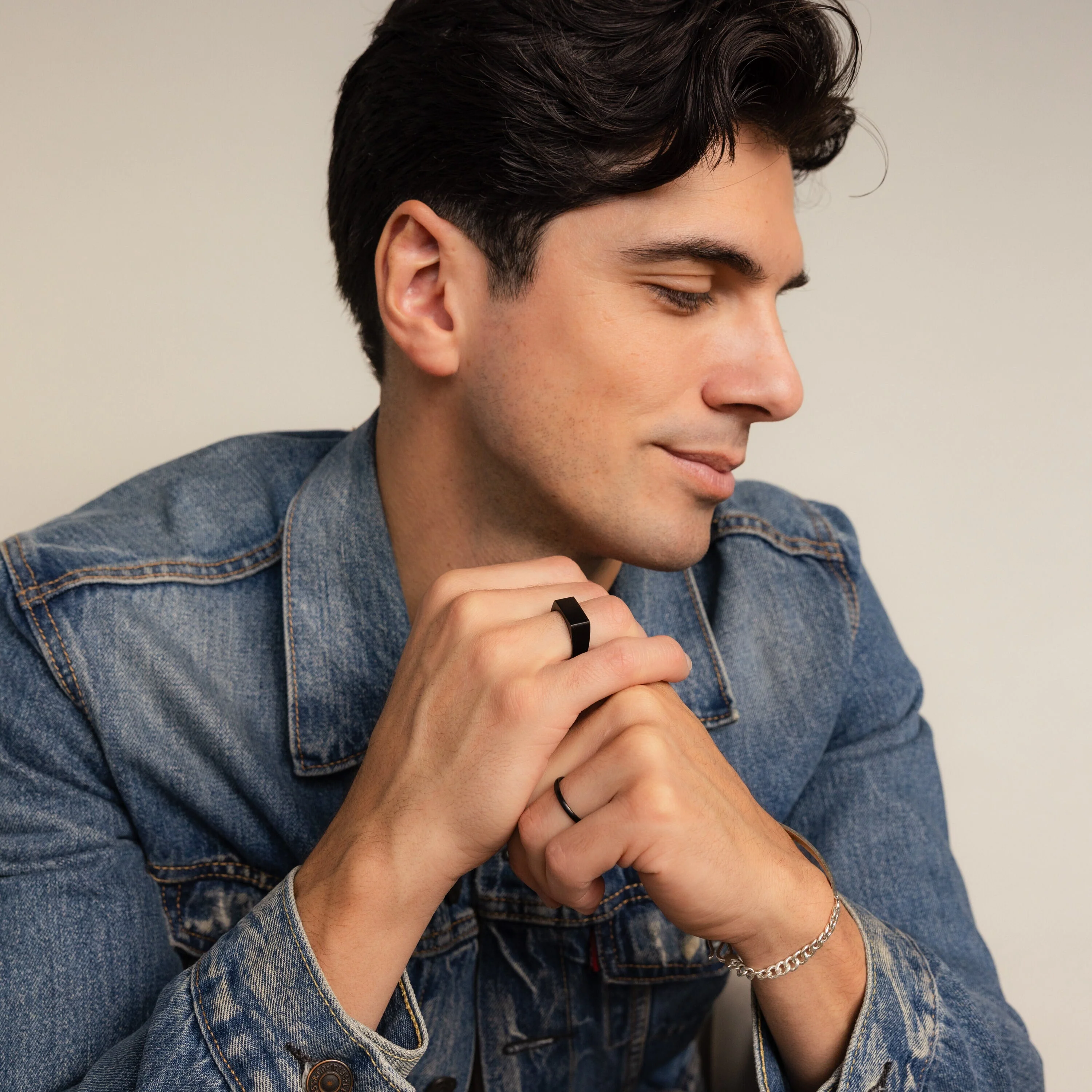 Designed to be a staple, everyday accessory—meet our Black Signet Ring—the ultimate ring for men he won't want to take off. The striking black hue enhances the traditional signet style, creating a piece that effortlessly transitions from casual to formal occasions. Worn alone emphasizes a minimalist statement, stacked with other rings achieves an elevated, bold look.