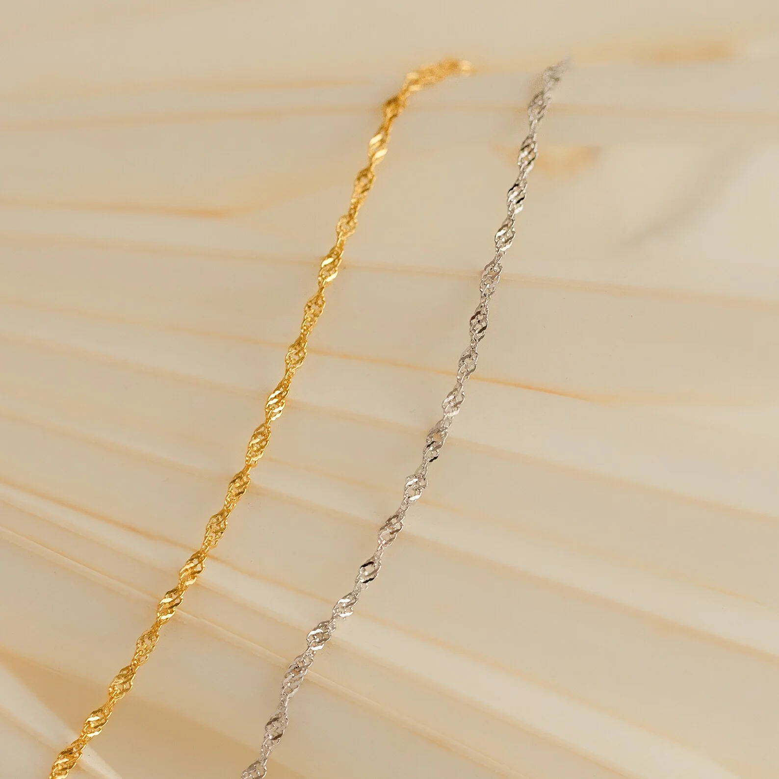 Our delicate Singapore Twist Chain Bracelet is perfect for everyday wear with its dainty and minimalist design. Versatile and pairs with any outfit effortlessly, you'll find yourself wearing this sparkly twist chain on repeat.